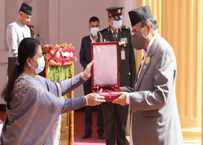 काठमाडौं - राष्ट्रपति विद्यादेवी भण्डारीले संविधान दिवस (राष्ट्रिय दिवस), २०७८ का अवसरमा घोषित विभिन्न विभूषण तथा मनपदवीबाट विशिष्ट व्यक्ति, राष्ट्रसेवक र सामाजिक क्षेत्रका व्यक्तिहरूलाई आज सुशोभन गरेकी छन् ।गत असोज ३ गतेको संविधान दिवसका अवसरमा नेपा ...