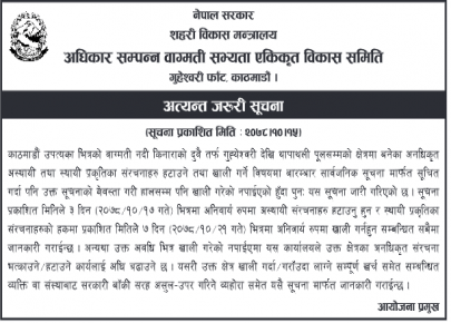 काठमाडाैं - अधिकार सम्पन्न बाग्मती सभ्यता एकीकृत विकास समितिले काठमाडौं उपत्यकाभित्रको बाग्मती नदी किनारमा निर्माण गरिएको अवैध संरचना हटाउन अल्टिमेटम दिएको छ ।सहरी विकास मन्त्रालय मातहतको समितिले शनिबार सार्वजनिक सूचना जारी गरी नदी किनाराको दुब ...