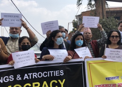 काठमाडौं - म्यानमार (बर्मा)मा सैनिक सत्ताद्वारा भैरहेको हत्या र दमनविरुद्ध, राजनीतिक बन्दीको बिना सर्त अविलम्ब रिहाइ र लोकतन्त्र बहालीको माग गर्दै मानव अधिकार तथा शान्ति समाजले २०७७ चैत २ गते नेपालस्थित म्यानमार दूतावास अगाडि प्रदर्शन गरेको छ ।ललितपु ...
