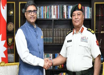 काठमाडौं - नेपाली सेनाका प्रधानसेनापति र भारतीय विदेशसचिव विक्रम मिश्रीबिच भेटवार्ता भएको छ।आज मिश्रीले जंगीअड्डा पुगेर प्रधानसेनापति अशोकराज सिग्देलसँग भेटवार्ता गरेका हुन् । भेटका क्रममा दुईपक्षीय पारस्परिक हितका बारेमा कुराकानी भएको जंगीअड्डा स्रो ...
