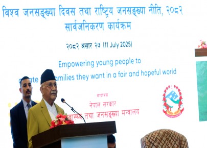 काठमाडौं - प्रधानमन्त्री केपी शर्मा ओलीले विकास र समृद्धिसँगसँगै जनसङ्ख्याको समान विकास नभए मानव अस्तित्व खतरामा पर्ने बताएका छन् ।विश्व जनसङ्ख्या दिवसका अवसरमा स्वास्थ्य तथा जनसङ्ख्या मन्त्रालयद्वारा आयोजित राष्ट्रिय जनसङ्ख्या नीति, २०८२ सार्वजनिक क ...