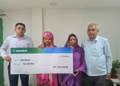 काठमाडौं - सानिमा बैंकले सानिमा दिर्घायु बचत योजना अन्तर्गत रु. १० लाखको दुर्घटना बीमा दाबी रकम भुक्तानी गरेको छ । यस बैंकका खातावाला उदय कुमार साहको दुर्घटना भई मुत्यु भएकोले निजको हकवाला श्रीमती आशा कुमारीलाई सानिमा दिर्घायु बचत योजना अन्तर्गत रु. ...