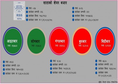 काठमाडौं - धितोपत्र बजारमा यस साता शेयर कारोबार मापक नेप्से परिसूचक उतारचढावपूर्ण रह्यो । नेप्से ओर्लने क्रम अगाडि बढ्दै जाँदा दुई हजार ८०० को विन्दुमा झरेको छ । झन्डै तीन हजार ३०० को विन्दुमा पुगेको नेप्से परिसूचक क्रमशः ओरालो लागेको हो । यस सा ...