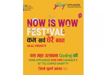 काठमाडौं - इलेक्ट्रोनिक्स ब्राण्ड गोदरेजले नजिकिरहेको नेपालीहरुको महान चाड दशैं र तिहारलाई लक्षित गर्दै "नाउ इज वाउ फेस्टिवल्, कम खर्च धेरै बचत" नामक योजना हालै बजारमा सार्वजनिक गरेको छ ।उक्त योजना अन्तर्गत गोदरेज ब्राण्डका कुनै पनि सामानको खरिद ...