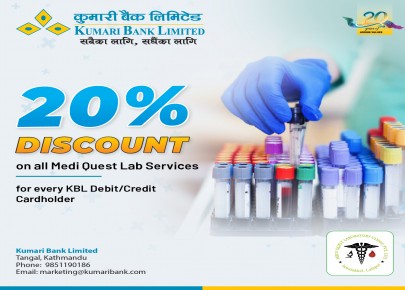 काठमाडौं - आफ्ना ग्राहकहरुलाई स्वदेशमै गुणस्तरीय स्वास्थोपचारमा सहुलियत दिने उद्देश्यले कुमारी बैंक लिमिटेड र जावलाखेल, ललितपुरस्थित मेडी क्वेस्ट् ल्याबरोटोरीसँग सम्झौता गरी आफ्ना सेवाग्राहीहरूलाई विभिन्न सुविधा उपलब्ध गराउने व्यवस्था गरेको छ । ...