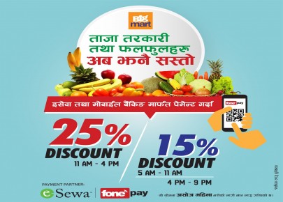 काठमाडौं - बिग मार्टमा सपिङ गर्दा इसेवा तथा फोनपे नेटवर्क मार्फत भुक्तानी गर्दा २५ प्रतिशतसम्म छुट पाइने योजना पुःन सूचारू भएको छ । डिजिटल भुक्तानीलाई प्रोत्साहन गर्ने उदेश्यले बिगमार्ट र इसेवाको सहकार्यमा सुरू भएको यो योजना कोरोना भाइरसका कारण दोस्र ...