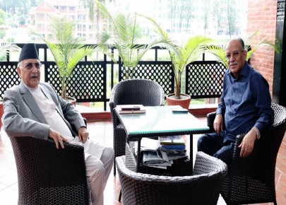 बालुवाटार पुगे ओली, प्रधानमन्त्री प्रचण्डसँग छलफल गर्दै