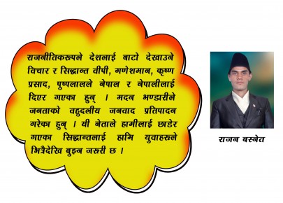 राजन बस्नेत विश्वका हरेक परिवर्तनमा युवाको महत्वपूर्ण योगदान हुनछ । राज्यको उदयसँगै राष्ट्र निर्माण तथा समाजको आर्थिक, सामाजिक तथा राजनीतिक विकासमा पनि युवाको भूमिका सधै अग्रणी रहँदै आएको छ । युवा नै परिवर्तनका वाहक हुन् र समाजलाई नेतृत्व दिने श ...