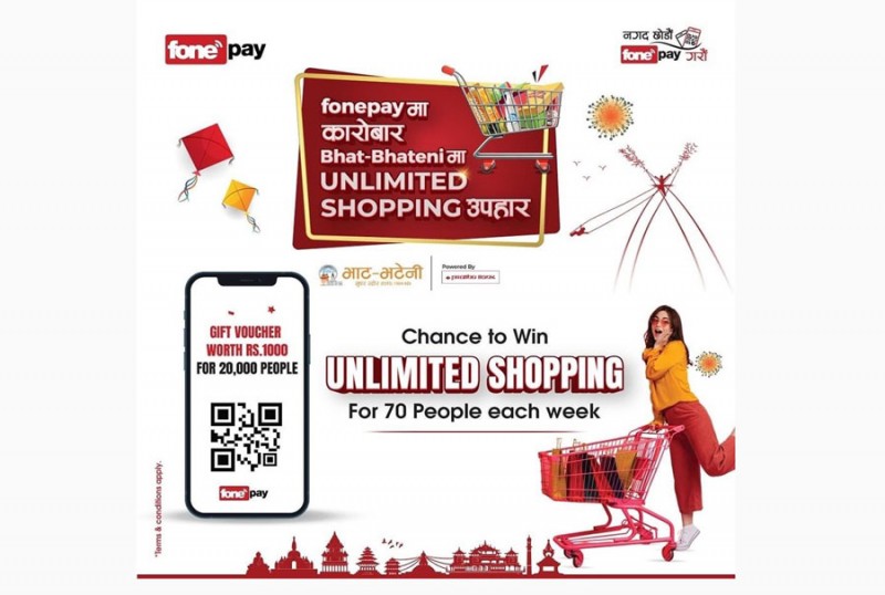 काठमाडौं - नेपालको अग्रणी भुक्तानी प्रणाली सञ्चालक फोनपेको क्यूआर मार्फत भाटभटेनि सुपर मार्केटमा भुक्तानी गर्दा अनलिमिटेड सपिङ्ग गर्न सकिने भएको छ । फोनपे, भाटभटेनी र प्रभु बैंकको सहकार्यमा अनलिमिटिड सपिङ्ग गर्न सकिने योजना सञ्चालन गरिएको हो ।