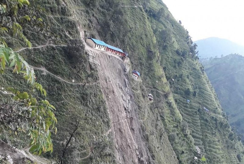 उनले भने, ‘लगातारको वर्षाका कारण भवनसमेत भत्कने खतरा छ, भिरालो जमिनमा विद्यालय भएकाले पहिरो खस्न थालेको हो ।’ कक्षा ८ सम्म पठनपाठन हुँदै आएको उक्त विद्यालयमा हाल २३५ जना विद्यार्थी अध्ययनरत छन् ।