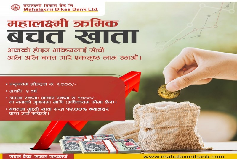 एक हजार रुपैयामै मुद्दती खाता खोल्न सकिने ‘महालक्ष्मी क्रमिक बचत खाता’ मा दैनिक मौज्दातमा १२ प्रतिशत व्याज गणना गरी उक्त व्याज त्रैमासिक रूपमा सँवामा गाभि एकमुष्ठ रुपमा भुक्तानी गरिने बैंकले जनाएको छ । यस योजना अन्तर्गत खाता खोल्ने ग्राहकले ५ बर्षसम्म जुनसुकै समयमा यस खातामा रकम जम्मा गर्न सक्नेछन । बैंकमा जुनसुकै बचत खाता खोलेका ग्राहकले मुद्दती खाता योजना अन्तर्गतको आकर्षक यस महालक्ष्मी व्रmमिक बचत खाता खोल्न सक्ने पनि बैकले जनाएको छ ।
