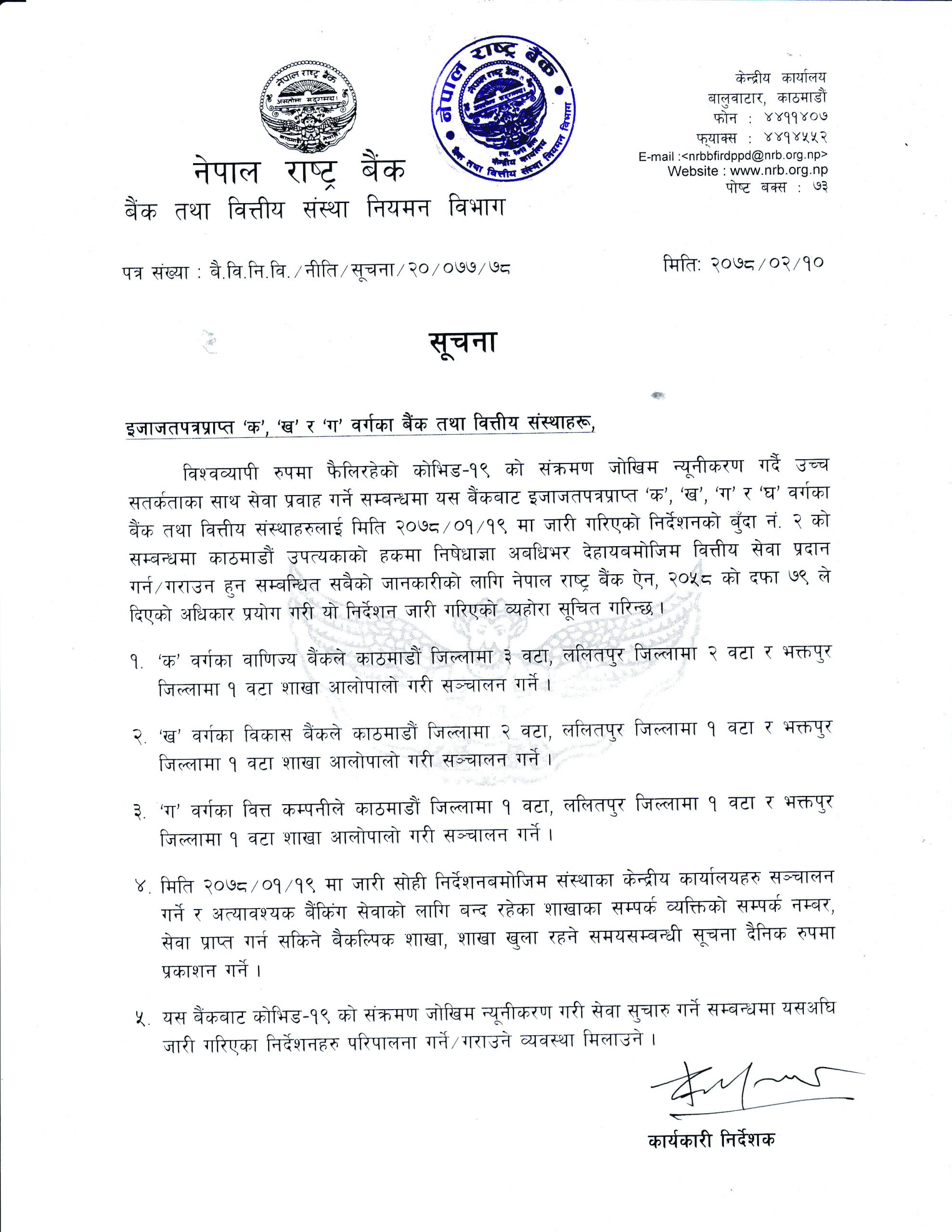 साथै, केन्द्रीय बैंकले अत्यावश्यक बैंकिङ सेवाको लागि बन्द रहेका शाखाका सम्पर्क व्यक्तिको सम्पर्क नम्बर, सेवा प्राप्त गर्ने वैकल्पिक शाखा, शाखा खुला रहने समयसम्बन्धी सूचना दैनिक रुपमा प्रकाश गर्न निर्देशन दिएको छ ।