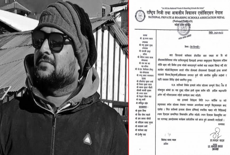 काठमाडौं - राष्ट्रिय निजी तथा आवासीय विद्यालय एसोसिएसन (नेशनल प्याब्सन) मधेश प्रदेशले विद्यालय सञ्चालक तथा प्रधानाध्यापक (प्रिन्सिपल) रुपेश सर्राफको हत्याविरुद्व आज विद्यालयहरू बन्द गर्ने भएको छ ।