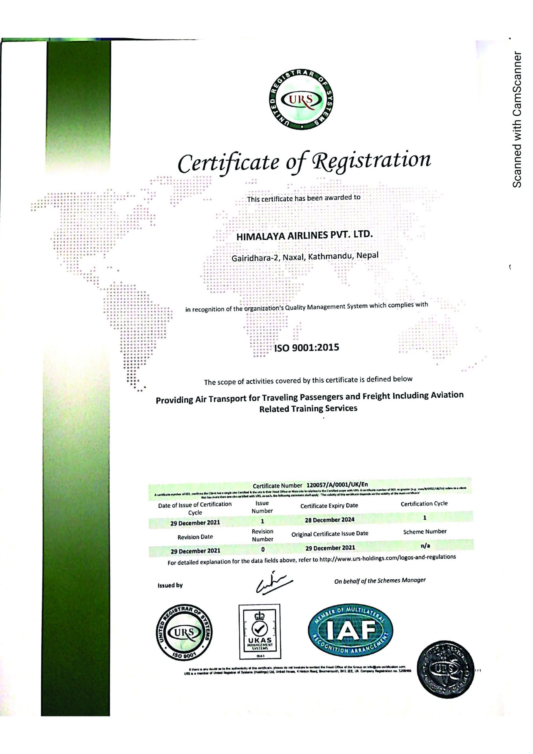आइएसओ ९००१ः२०१५ प्रमाणपत्र नम्बर 120057/A/0001/UK/En संयुक्त अधिराज्य स्थित ‘युनाइटेड रजिस्ट्रार अफ सिस्टम्स्’ र ‘युनाइटेड किङ्गडम एक्रिडिटेसन सर्भिस (UKAS) द्वारा हिमालय एअरलाइन्स्लाई प्रदान गरिएको थियो । व्यवस्थापन प्रक्रियाका सुक्ष्म आयामहरु, मापदण्डहरु पूरा गर्दै हिमालयले सफलतापूर्वक परिक्षणका सबै प्रक्रियाहरु पूरा गरेको र कम्पनीको समग्र व्यवस्थापन प्रणाली बैधानिक एवम् नियामकता सम्बन्धी महत्वपूर्ण सबै मापदण्ड अनुरुप भएका प्रमाणित गर्दै एअरलाइन्स्ले यो प्रमाणिकरण प्राप्त गरेको हो ।