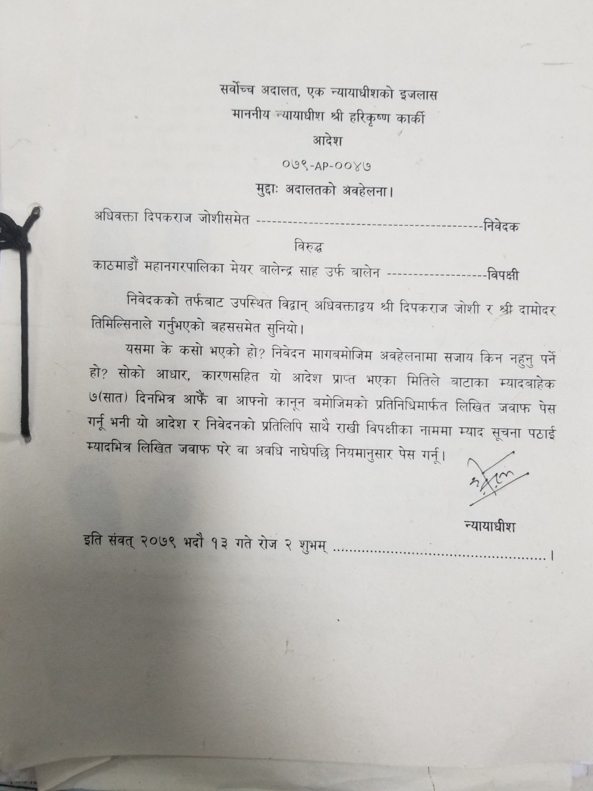 बालेनविरूद्ध परेको रिटको सोमबार सुनुवाइ गर्दै सर्वोच्च अदालतका न्यायाधीश हरिकृष्ण कार्कीको इजलासले बालेनसँग लिखित जवाफ माग्ने आदेश गरेको हो।
