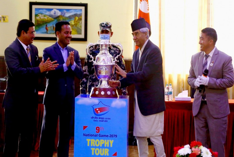 सरकारले पहिलो पटक राष्ट्रिय खेलकुद प्रतियोगिताका लागि रनिङ ट्रफीको निर्माण गरेको हो । करिव १० लाख रुपैयाँमा राष्ट्रिय खेलकुदको विजेता टिमका लागि ट्रफी बनाइएको हो । लगातार तीन संस्करणको प्रतियोगिता जित्ने टिमले स्थायी रुपमा विजेता ट्रफी आफूसँग राख्न पाउनेछ । नवौं राष्ट्रिय खेलकुदको रनिङ ट्रफीलाई प्रदर्शनीका लागि सातै प्रदेश र तीन विभागिय टोलीमा पु-याईनेछ । राष्ट्रिय खेलकुद परिषद (राखेप) ले ओलम्पियन एवं दक्षिण एशियाली खेलकुदका कीर्तिमानधारी दीपक बिष्टको संयोजकत्वमा ५ सदस्यीय ट्रफी टूर कार्यदल गठन गरेको छ ।
