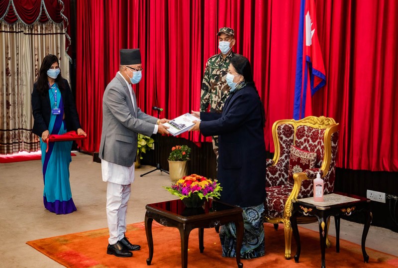 काठमाडौं - राष्ट्रपति विद्यादेवी भण्डारीसमक्ष निर्वाचन आयोगले वार्षिक प्रतिवेदन पेस गरेको छ । आयोगका प्रमुख निर्वाचन आयुक्त दिनेशकुमार थपलियाले राष्ट्रपति समक्ष नेपालको संविधानको धारा २९४ को उपधारा (१) बमोजिम निर्वाचन आयोगको आर्थिक वर्ष २०७७/०७८ को वार्षिक प्रतिवेदन आज पेस गरेका हुन् ।