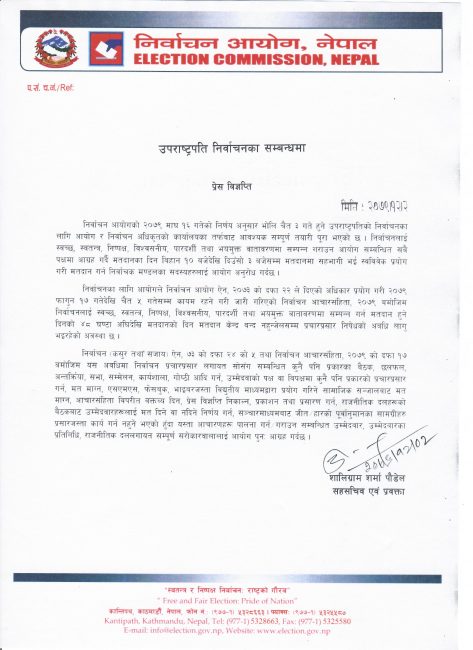 मौनअवधि सुरु भएकाले उपराष्ट्रपतिबारे बैठक बसेर निर्णय नलिनू : निर्वाचन आयोग