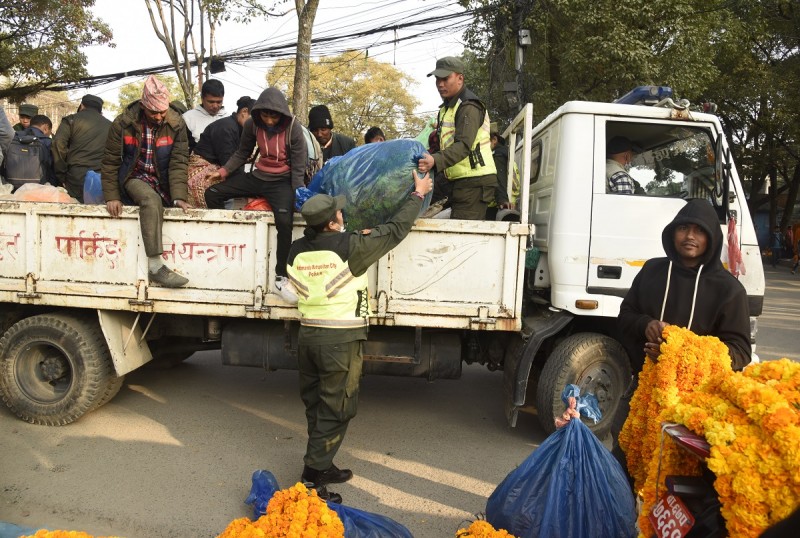 काठमाडौं - महानगर प्रहरी बलको सवारी साधनमा राखेर विभिन्न ठाउँमा रहेका किसानलाई सामनसहित तोकिएको विक्री स्थलमा पुर्याइएको छ । तिहार लक्षित फूल र माला लिएर बेच्न आएका किसानहरु नयाँ सडकसहित सहरका विभिन्न ठाउँमा पुगेका थिए । उनीहरुलाई विक्री स्थल थाहा नभएकोले सवारी साधनमा राखेर विक्री स्थलमा पुग्न सहयोग गरिएको हो ।