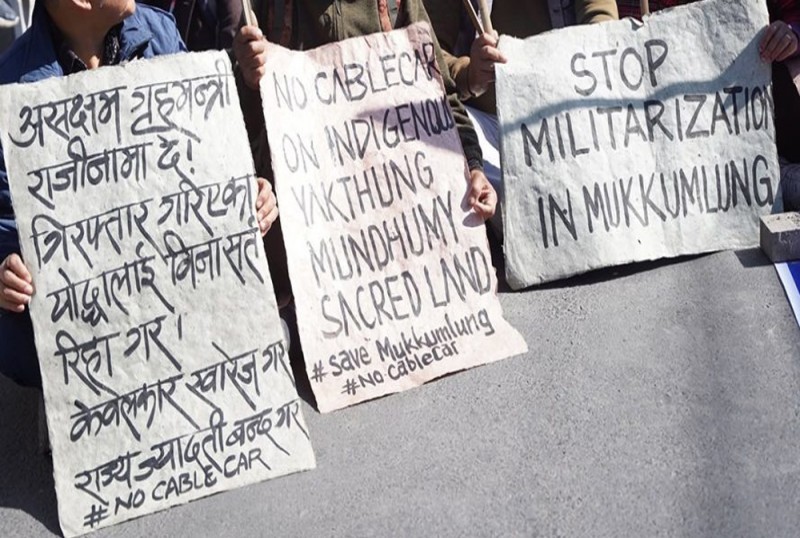 विभिन्न प्लेकार्डसहित ताप्लेजुङको पाथीभरा मुक्कुम्लुङ क्षेत्रमा देखिएको विवादमा केबलकारविरोधी समूहले प्रदर्शन गरेको हो ।