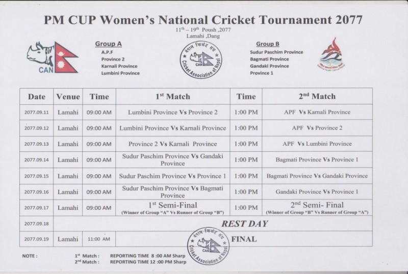 काठमाडौं - प्रधानमन्त्री कप महिला क्रिकेट प्रतियोगिता आजबाट शुरु हुँदैछ। दाङको लमहीमा आजबाट सुरु हुने प्रतियोगिता १९ गते सम्पन्न हुनेछ। प्रतियोगितामा आज दुई खेल हुँदैछन्। आजको पहिलो खेलमा लुम्बिनी प्रदेश र प्रदेश २ प्रतिस्पर्धा गर्नेछन् भने दोस्रो खेलमा एपीएफ र कर्णाली प्रदेश भिड्ने छन्।