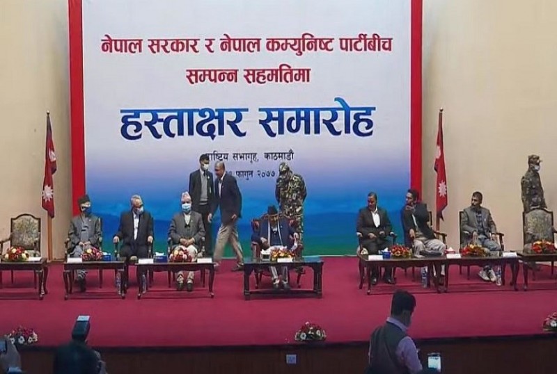 शुक्रबार राष्ट्रियसभा गृहमा आयोजित विशेष समारोहमा प्रधानमन्त्री केपी शर्मा ओली र नेकपा महासचिव विप्लवको उपस्थितिमा सरकारी टोलीको तर्फबाट गृहमन्त्री रामबहादुर थापा र विप्लव समूहका तर्फबाट प्रकाण्डले हस्ताक्षर गरे ।