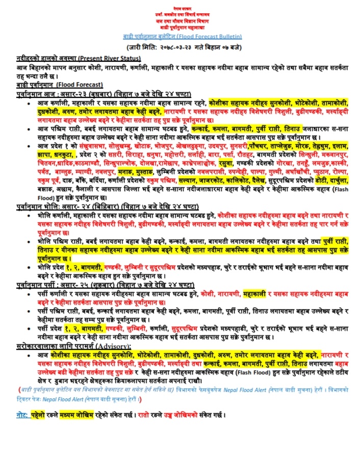 यस्तै, सप्तकोसी र यसका सहायक नदीहरू सुनकोसी, भोटेकोसी, तामाकोसी, दूधकोसी, अरुण तमोरलगायतमा बहाव बढ्नेछ । केहीमा सतर्कता तह आसपास पुग्न सक्ने पूर्वानुमान छ ।