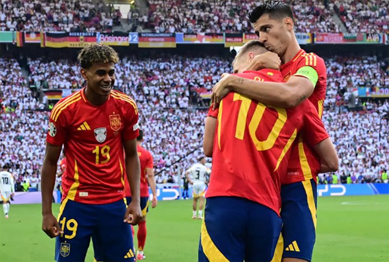 काठमाडौं - स्पेन युरोकपको सेमिफाइनलमा पुगेको छ । जारी युरोकपको क्वाटरफाइनलमा स्पेनले आयोजक जर्मनीलाई २-१ गोल अन्तरले पराजित गर्दै स्पेन प्रतियोगिताको सेमिफाइनलमा पुगेको हो ।