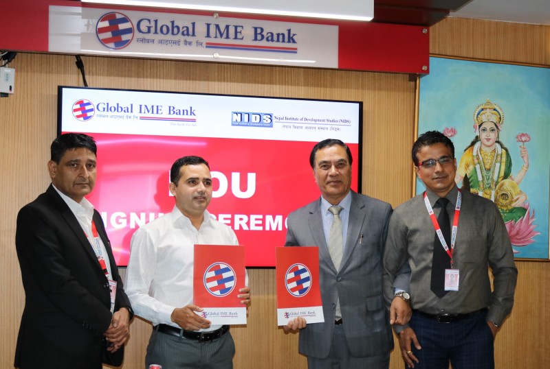 काठमाडौं - ग्लोबल आइएमई बैंक लिमिटेड र नेपाल विकास अध्ययन संस्थानबीच लक्षित समुदाय तथा क्षेत्रका व्यक्तिहरूलाई सहुयितपुर्ण कर्जा साथै वित्तीय साक्षरता एवम् उद्यमशीलता तालिम उपलब्ध गराउने समझदारी पत्रमा हस्ताक्षर भएको छ ।