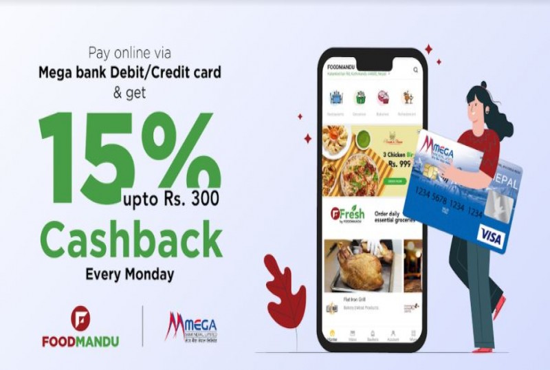 काठमाडौं - फुडमान्डु र मेगा बैंकबीच बैंकको डेबिट र क्रेडिट कार्डमार्फत भुक्तानी गर्ने ग्राहकले यस हप्तादेखि प्रत्येक सोमबार अर्डर गर्दा अधिकतम तीन सयसम्मको १५ प्रतिशत क्यासब्याक पाउने समझादारी भएको छ ।