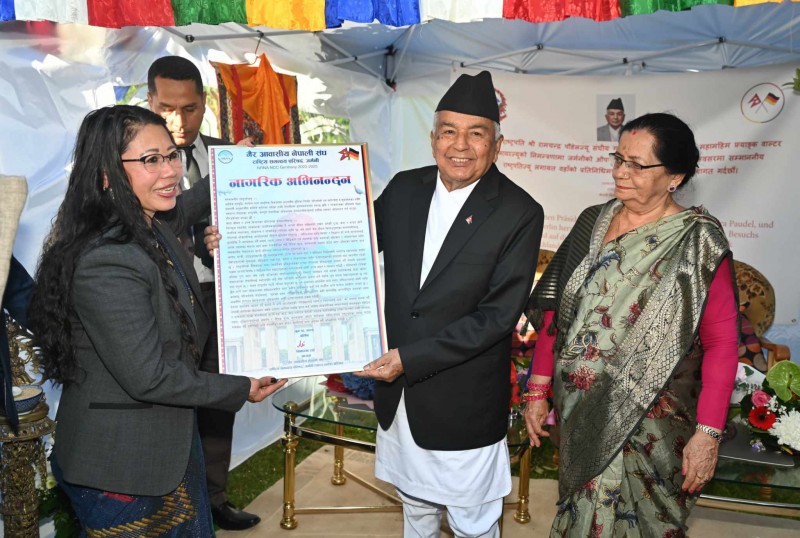 काठमाडौं - मित्रराष्ट्र जर्मनीको भ्रमणमा रहेका राष्ट्रपति रामचन्द्र पौडेलको सम्मानमा जर्मनीको वर्लिनस्थित नेपाली राजदूतावासले आाइतबार विशेष स्वागत समारोह आयोजना गरेको छ।