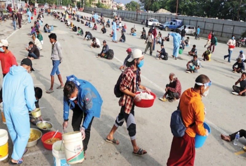 एक–दुई जना गर्दै खाना खान आउनेहरूको संख्या केही मिनेटमा नै गन्नै मुस्किल पर्छ । त्यत्तिकैमा खानासहितको एउटा गाडी वीर अस्पतालको गेट तर्फबाट भित्र पस्छ । भोको पेट भर्न आएकाहरू गाडी चिन्छन् र आफूले लगाएका चप्पल खोलेर लाइन लागेर भुइँमा बस्छन् । हरियो ज्याकेट लगाएका युवाहरू कागजका प्लेट तथा कप बाँड्न थाल्छन् । खाना बाँड्न सुरु हुन्छ । मान्छे थपिएको थपियै छन् ।