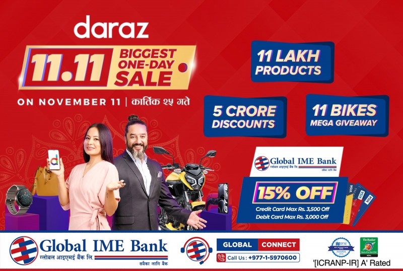 काठमाडौं - ग्लोबल आइएमई बैंक लिमिटेडका ग्राहकहरुले दराजको ११ः११ अफरमा दराजबाट अनलाइनमार्फत सामान किन्दा १५ प्रतिशत छुट दिने योजना सार्वजनिक गरेको छ । यस छुट योजनाअन्तर्गत ग्राहकहरुले ग्लोबल आइएमई बैंकको डेबिट वा क्रेडिट कार्ड प्रयोग गरी नोभेम्बर महिनाको ११ तारिखमा दराजबाट अनलाइनमार्फत सामान खरिद गर्दा कुल खरिदको १५ प्रतिशत छुट पाउनेछन् ।