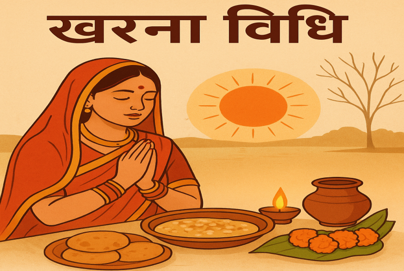 यो विधिलाई मिथिलामा ‘खरना’ भनिन्छ । त्यस्तै, मुख्य दिन भोलि सोमवार ठेकुवा, भुसवालगायत कृषिजन्य अन्नको पिठोबाट बनाइएका पकवानहरूसँगै केराको घरी, माटोको हात्ती, सूप, कनसुपती, कलशसहितको घैँटोलगायत सामग्रीको स्वच्छता र पवित्रतापूर्वक व्यवस्था गरिन्छ र बेलुका अस्ताउने सूर्यलाई अर्घ्य दिइन्छ ।