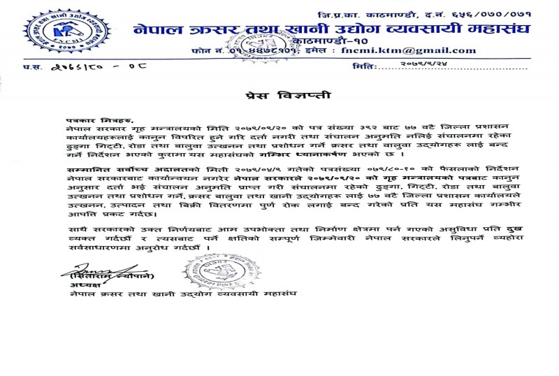 विज्ञप्तिमा भनिएको छ, 'सर्वोच्च अदालतको गत साउन ९ गतेको पत्रसंख्या ०७९/८०-१० को फैसलाको निर्देशन नेपाल सरकारबाट कार्यान्वयन नगरेर नेपाल सरकारले पुस २० को गृह मन्त्रालयको पत्रबाट कानुन अनुसार दर्ता भई सञ्चालन अनुमति प्राप्त गरी सञ्चालनमा रहेको ढुङ्गा, गिट्टी, रोडा तथा बालुवा उत्खनन तथा प्रशोधन गर्ने, क्रसर बालुवा तथा खानी उद्योगहरू लाई ७७ वटै जिल्ला प्रशासन कार्यालयले उत्खनन, उत्पादन तथा बिक्री वितरणमा पूर्ण रोक लगाई बन्द गरेको प्रति यस महासंघ गम्भीर आपत्ति प्रकट गर्दछ ।'