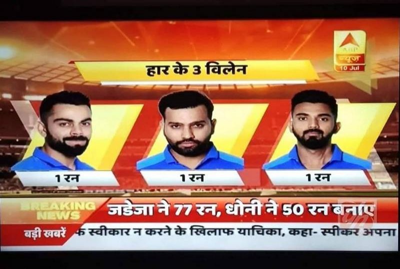 म्यान्चेस्टरको ओल्ड ट्रार्फोडमा खेलाइएको खेलमा न्युजिल्यान्डसँग भारत १८ रनले पराजित भएपछि भारतीय मिडियाले विराट कोहली, केएल राहुल र रोहित शर्मालाई भिलेन भनेका हुन्।