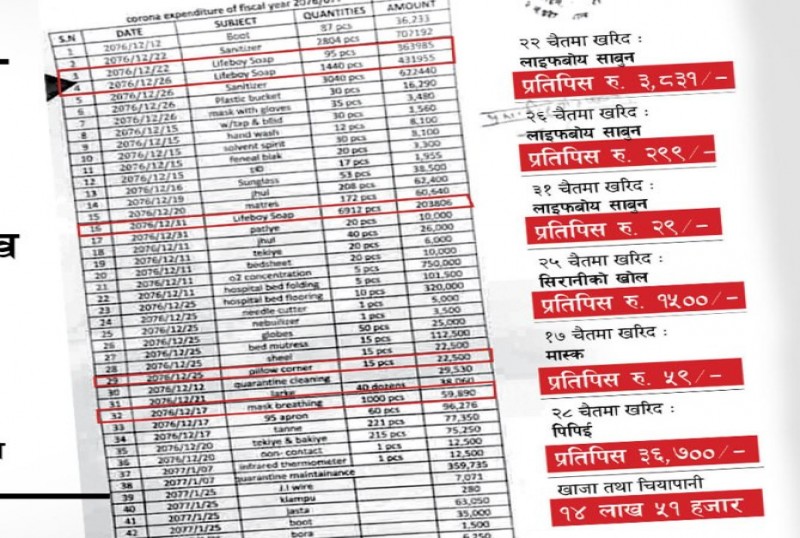 काठमाडौं - जनताका लागि महामारी बनेको कोभिड केही जनप्रतिनिधिका लागि भने कसरी मौका बनिरहेको छ, एउटा अर्को उदाहरण सप्तरीको बोदेबरसाइन नगरपालिकाले प्रस्तुत गरेको छ । यो नगरपालिकाले ३० रुपैयाँ पर्ने लाइफबोय साबुनलाई तीन हजार तिरेको विवरण तयार पारेको छ । त्यस्तै, क्वारेन्टिन व्यवस्थापनका नाममा किनिएका दर्जनौँ सामग्रीमा ढुकुटीबाट लुट मच्चाइएको छ ।