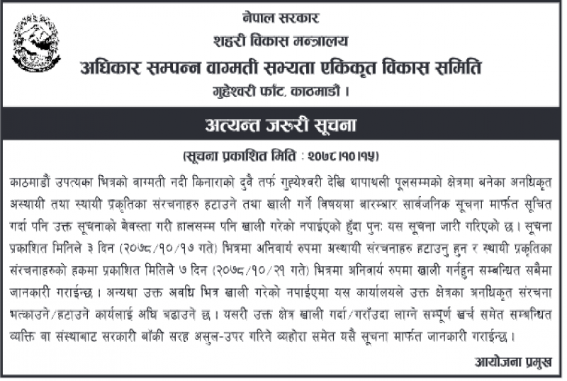 सहरी विकास मन्त्रालय मातहतको समितिले शनिबार सार्वजनिक सूचना जारी गरी नदी किनाराको दुबैतर्फ गुह्येश्वरीदेखि थापाथलीसम्मको क्षेत्रमा बनेका अनधिकृत अस्थायी तथा स्थायी संरचना हटाउन तथा खाली गर्न भनेको हो ।